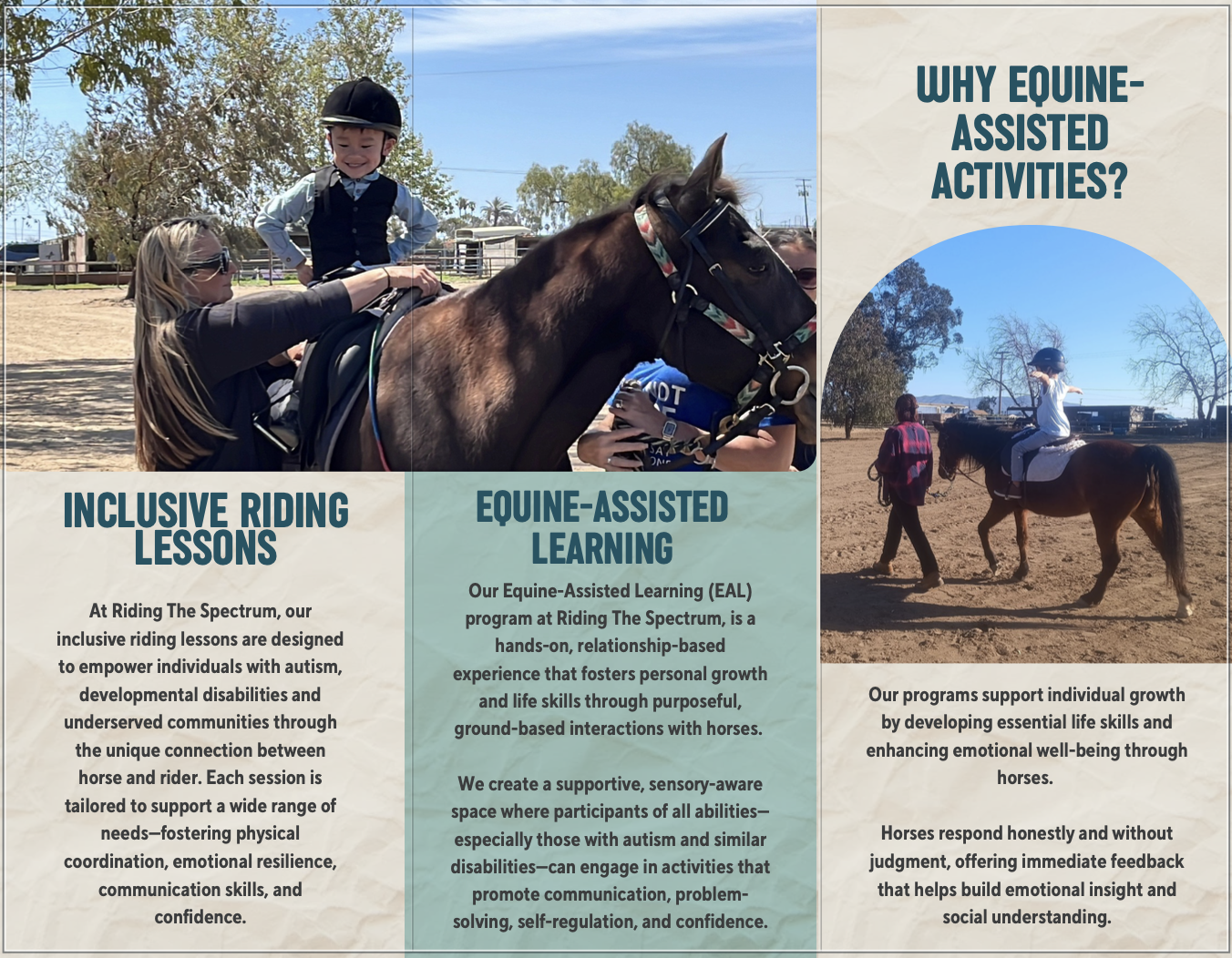 At Riding the Spectrum, we empower individuals with autism, other developmental differences and underserved communities by fostering personal growth and therapeutic progress through equine-assisted programs that cultivate the human-horse bond.